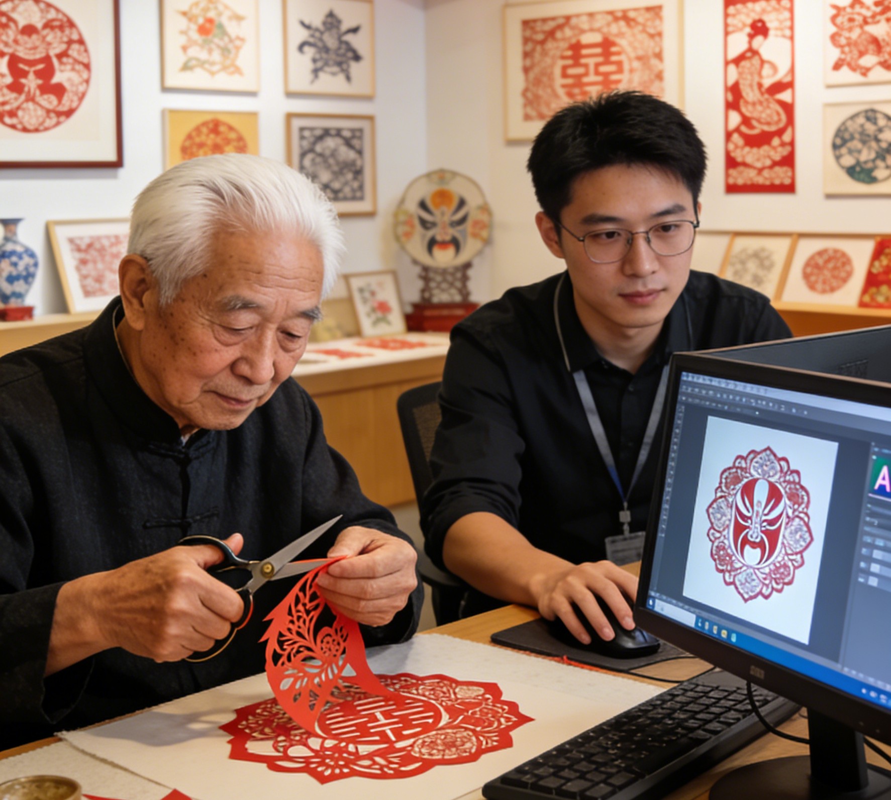 这岗位看着酷炫,实则是“用技术传递温度”。初期,AI生成的剪纸不是胖头鱼的既视感,就是比例跑偏的怪样子,丑得让人哭笑不得。Z明白,AI缺的不是技术,而是对文化的理解——她的工作意义,就是做“非遗与AI的桥梁”。Z所在的团队加班整理数千张剪纸图样,标注纹样寓意、色彩美学,还请大师传经送宝。